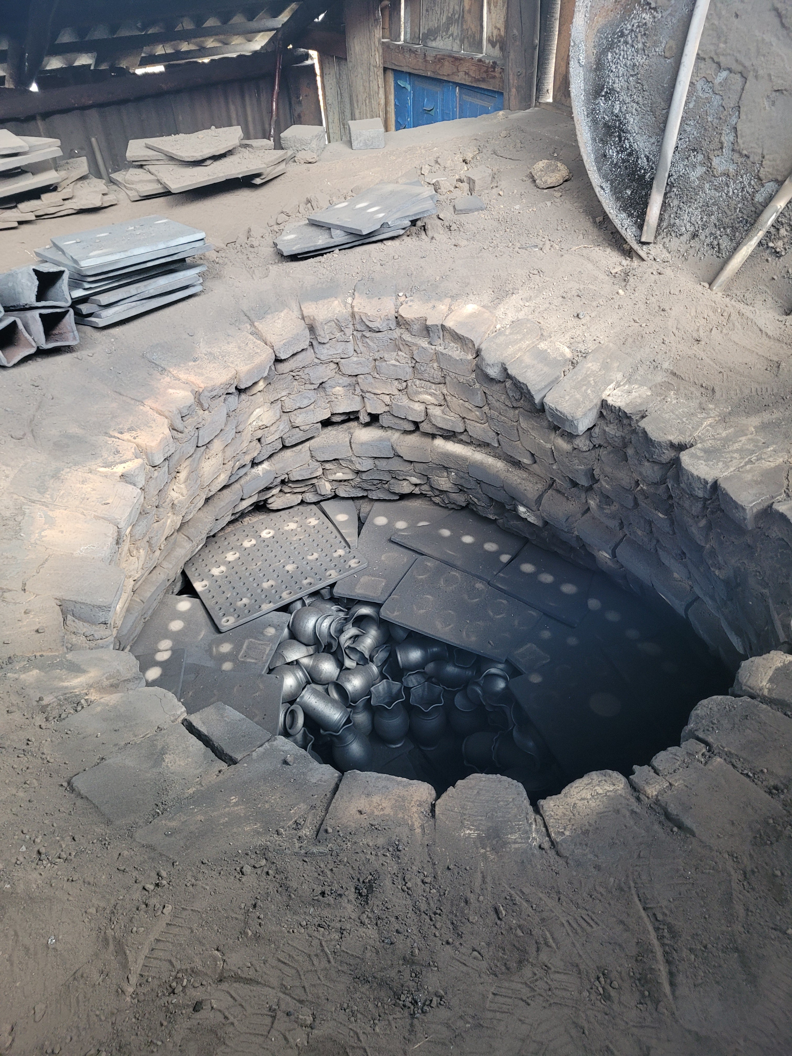 La fumée s'infuse lentement dans les poteries (comme un bon thé). Pour obtenir ce noir profond, du bois de sapin est utilisé.